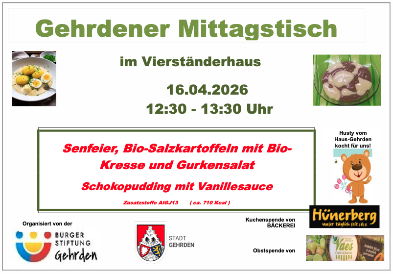 Einmal wöchentlich wird ein Mittagstisch im Vierständehaus angeboten, bei dem sich Mitbürger/innen zum Mittagessen treffen können. Das Projekt dient dem kommunikativen Austausch der Teilnehmer und ist auch ein Projekt gegen Einsamkeit.